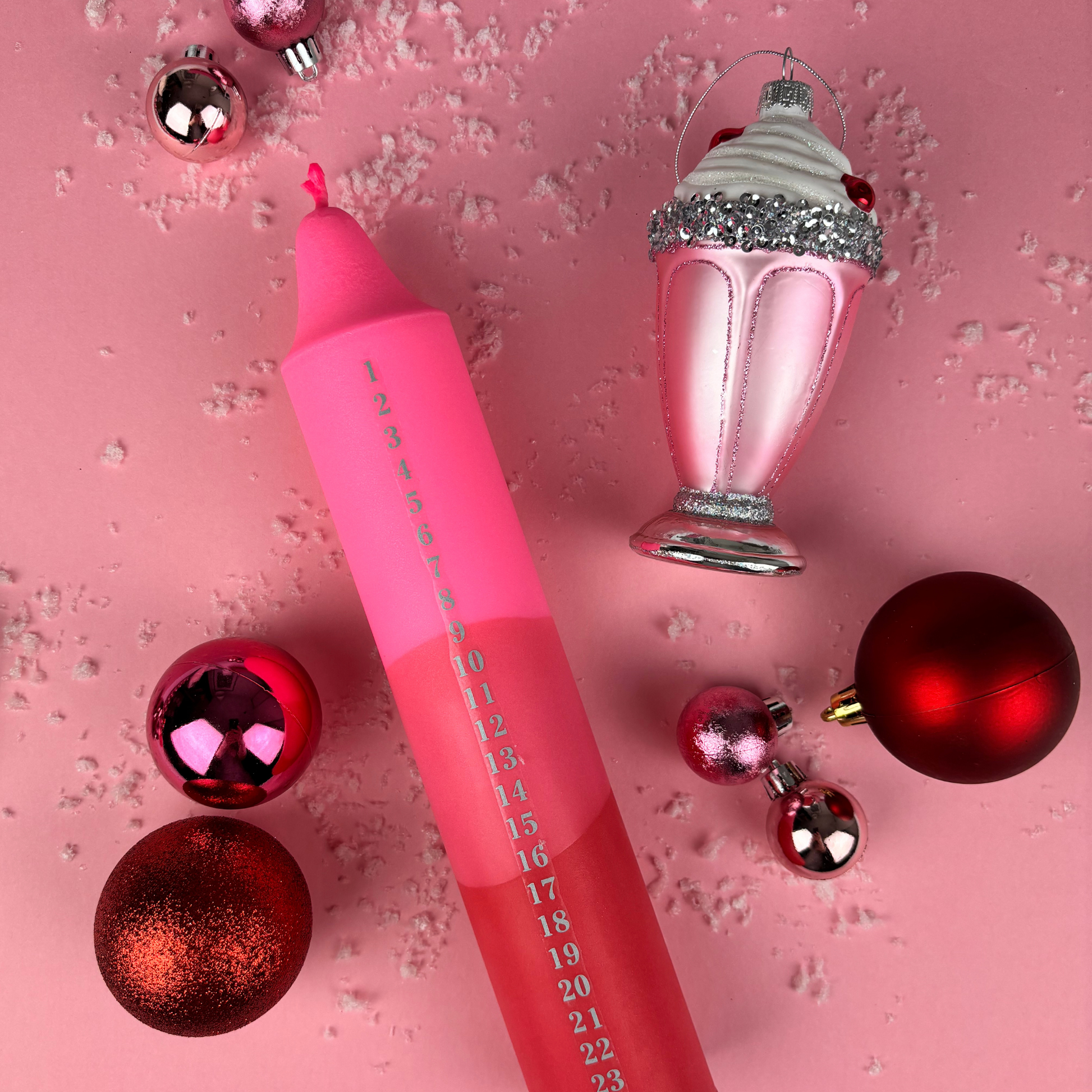Pink kalenderlys med sølv kalendertal.